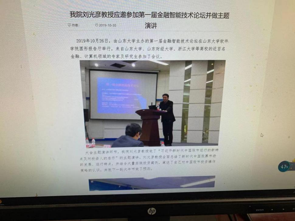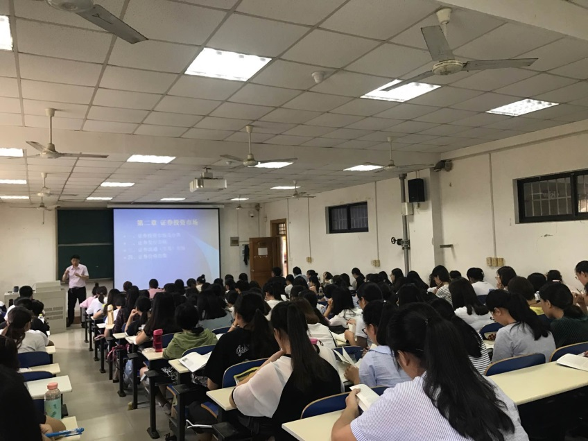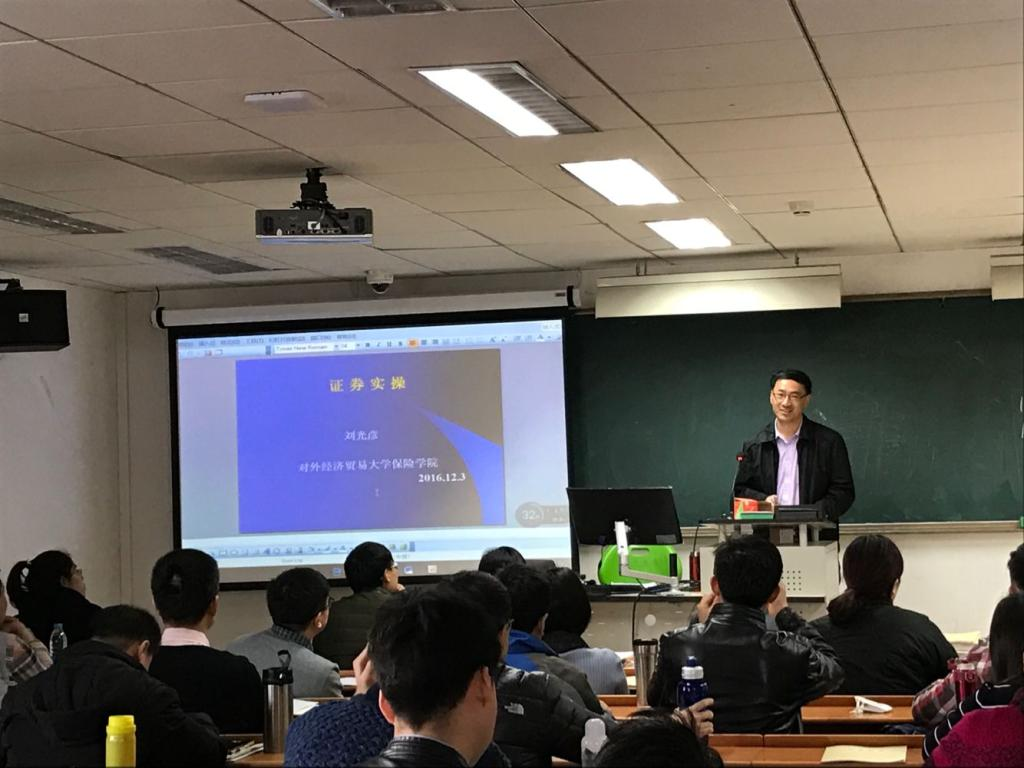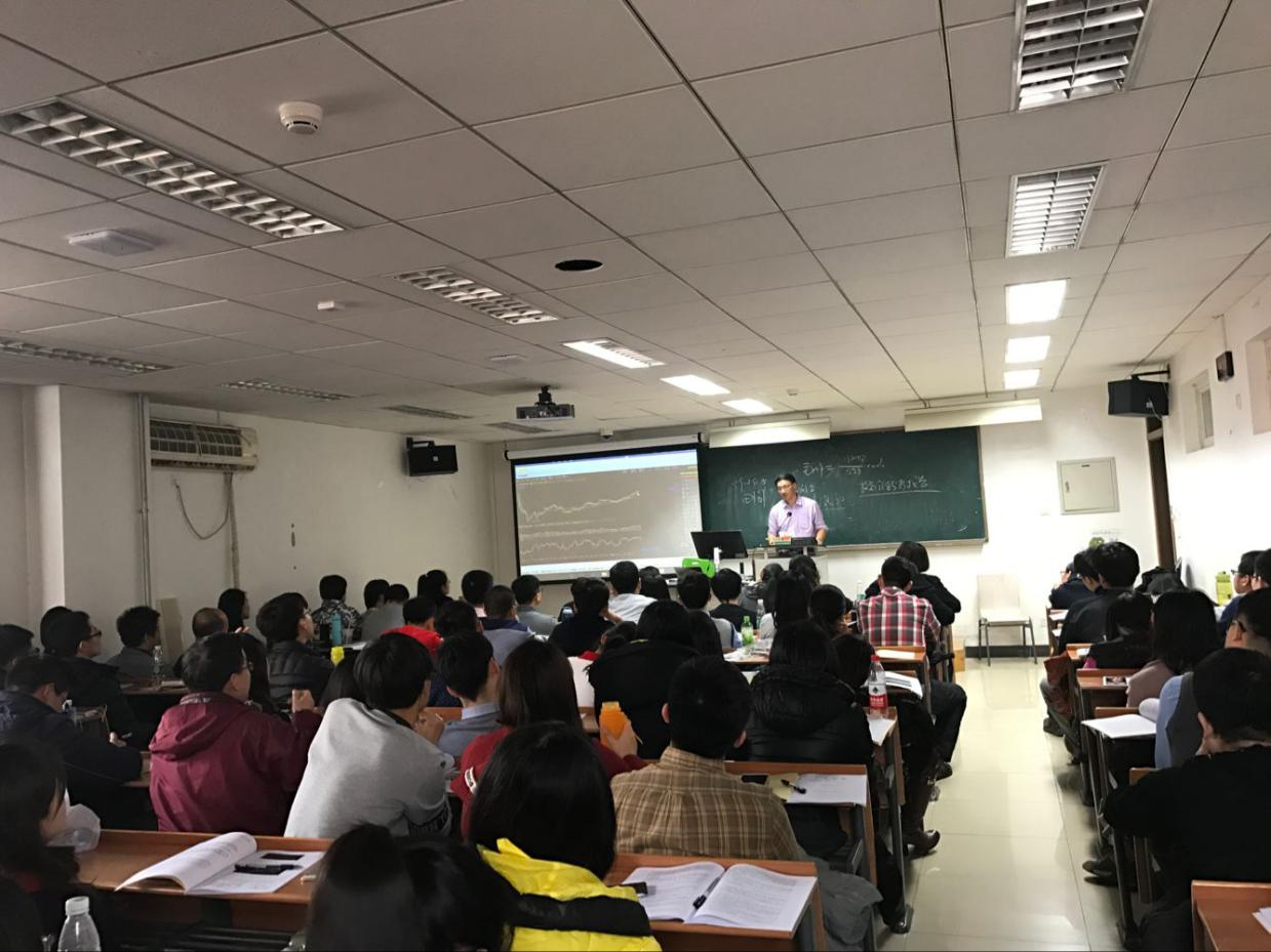 图八:2016.12.3为对外经济贸易大学金融学专业16级硕士生讲《证券实操》,应到100人,实到130人,有部分是2015.7月听过课的学生。2016年12月3日在对外经济贸易大学宁远楼628教室(能容纳学生120人)2016级金融学专业硕士研究生《证券实操》讲课中,应到100名学生实到130多人,有十多人站着听课,场面火爆。