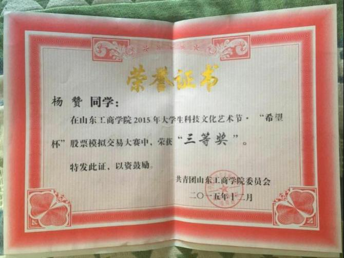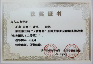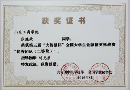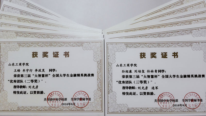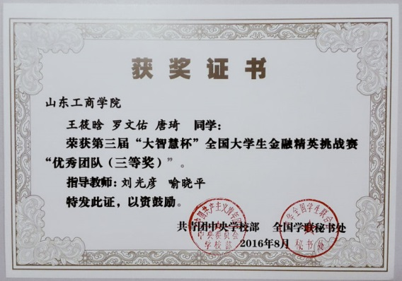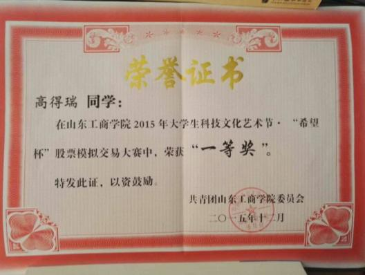图六:2015.10指导学生参加山东工商学院和华泰证券组织的证券期货外汇大赛中一人获得一等奖,两人获得三等奖,两人获得优胜奖(以上均为前十名)