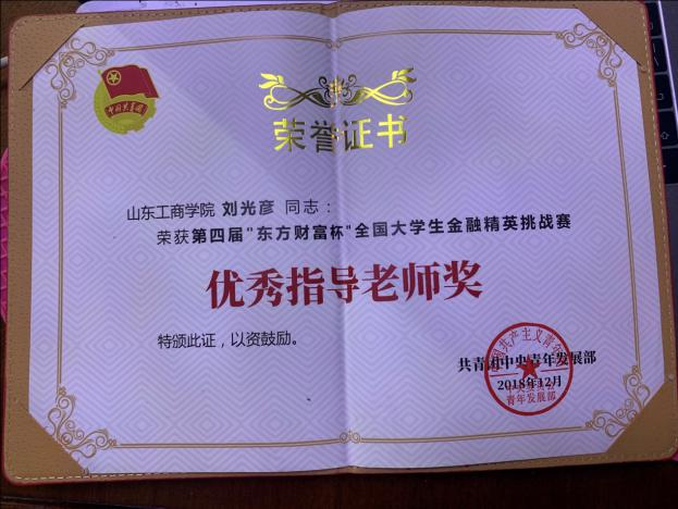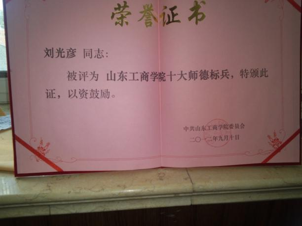 2012年9月以最高票5298票被评为山东工商学院首届十大师德标兵