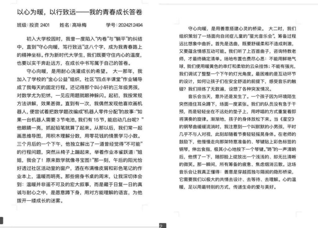 月7日至8日,学院线上开展心理健康征文活动。同学们踊跃投稿,以“以心为暖,以行致远”等为主题,写下自己在青春成长中的心理感悟、情绪故事与成长思考。一篇篇征文作品情真意切,既是同学们对自我心灵的探索与梳理,也为彼此搭建了交流心声、相互鼓励的桥梁。