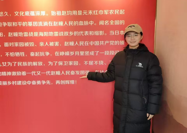 1月26日,徐萌同学深入赵曈村地雷战红色遗址,她聆听英雄树作为当年民兵瞭望哨,守护村庄、传递敌情的过往;在刻有“第一颗地雷埋藏地”的石碑前,了解赵同伦等民兵首战告捷的壮举。通过此次探访,她真切感受了革命先辈就地取材制雷、百折不挠抗敌的勇气,同时增强对党的认同与追随,努力成长为有理想、敢担当、能吃苦、肯奋斗的新时代青年。